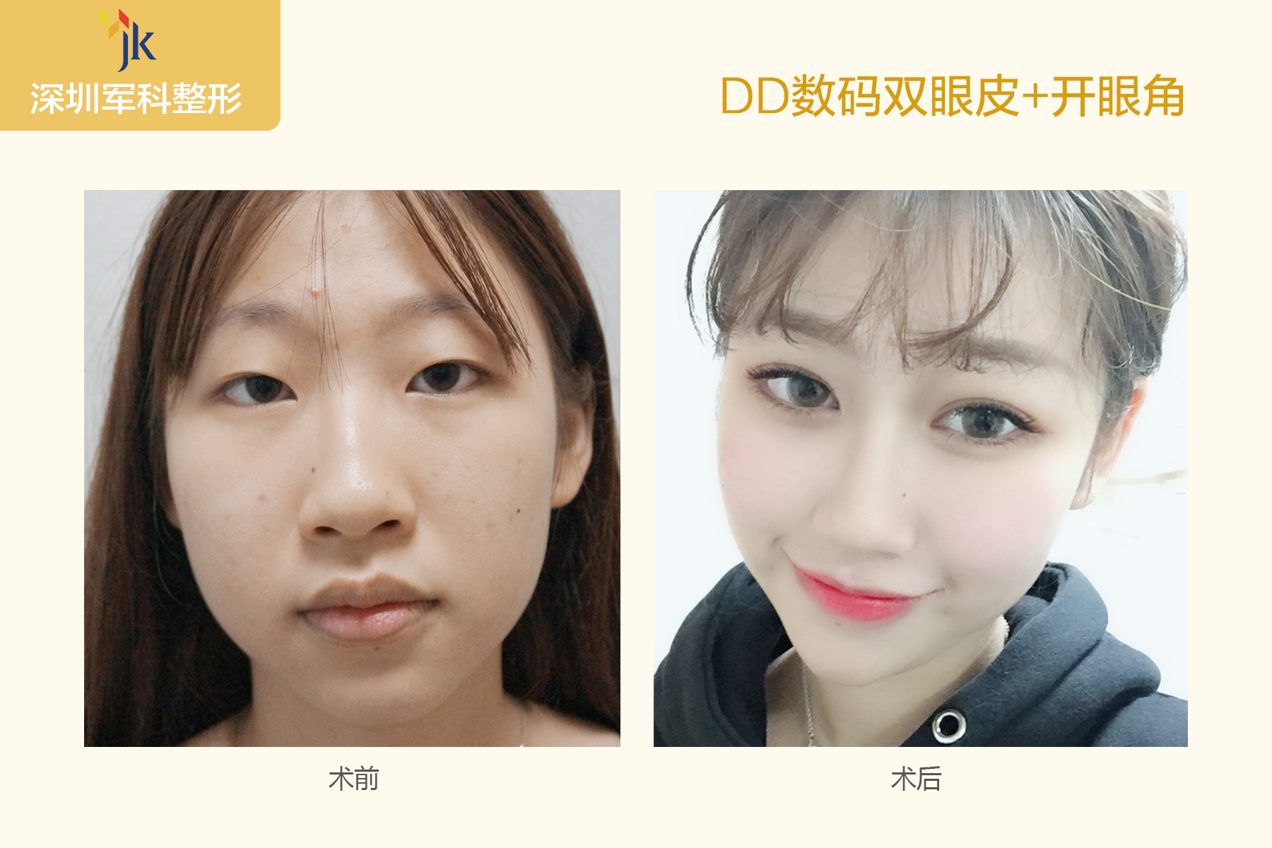 双眼皮手术案例对比图 特色技术 深圳军科双眼皮专利技术——DD数码双眼皮 经过多年的实践经验,深圳军科门诊部刘月更博士,通过大量临床实践,研发出一套属于自己的专利——D D 数码双眼皮。针对个人眼形、面部五官比例及整体气质,精确计算外眼角与内眼角高度比例、眼裂的长与宽比例、眼睑与眉毛的位置比例、眼鼻比例等,按眼型`较佳 长宽比D D进行小眼变大改变眼型手术。
