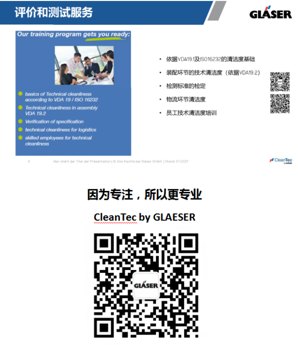 Glaeser Clean Tec 的专家为您优化生产装配流程,以确保其符合 VDA 19 和 ISO16232 标准的技术清洁度 要求。我们的服务范围包括零部件清洁度分析,咨询,以及 分析所用的检测设备。该检测设备为我公司自主研发生产。 在 GlaeserCleanTec 检测实验室,您可以获得与技术清洁相关的所有信息,并且分享我们作为服务提供商和设备制造商所积累的多年专业知识。 借助 Glaeser CleanTec 检测实验室的服务可以提高您公司部件的清洁度,从而获得高客户满意度,并我们能够满足您个性化的要求。 Glaeser CleanTec 是您在技术清洁领域的最佳合作伙伴。