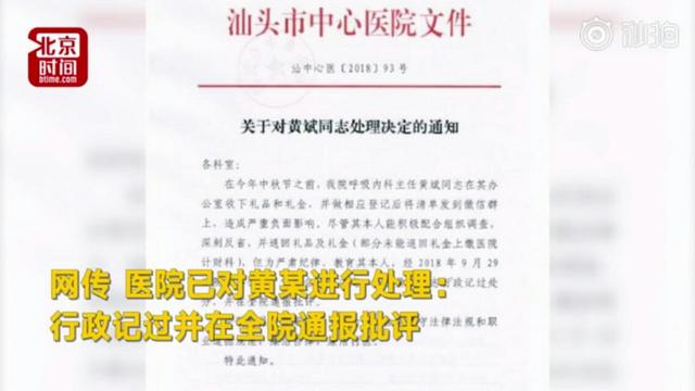 近日,汕头市中心医院呼吸内科主任黄某错将自己中秋节的收礼清单发到微信工作群内,涉及多种高档礼品及数万元现金。网传医院对其行政记过,并通报批评。 中秋收礼清单图 9月30日,汕头中心医院纪检科称,此事目前正在调查处理中。 对私爆料事件,你有什么想